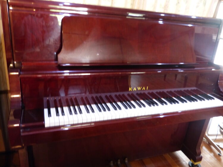 カワイの背の高めのワインカラー艶出し塗装のアップライトピアノです。